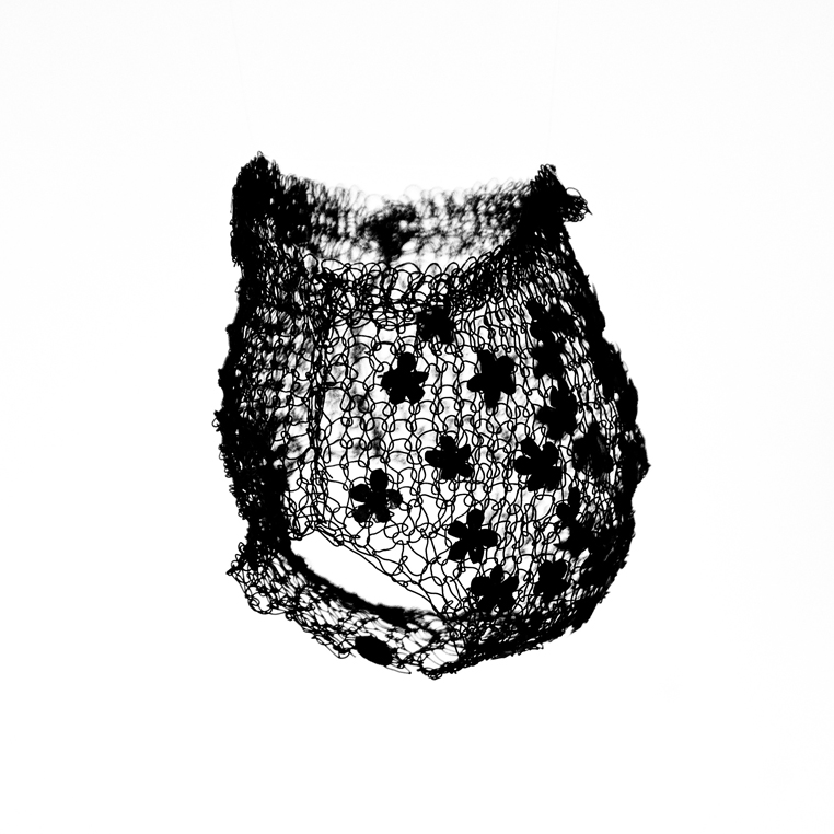 Using textile techniques taught to her by her mother many years ago, coupled with her experience of goldsmithing and costume design, Lynn knits metal wire which, for some works, she combines with felted and dyed wool to meticulously recreate the birthday dresses, nightgowns, bonnets and booties she wore as a little girl.